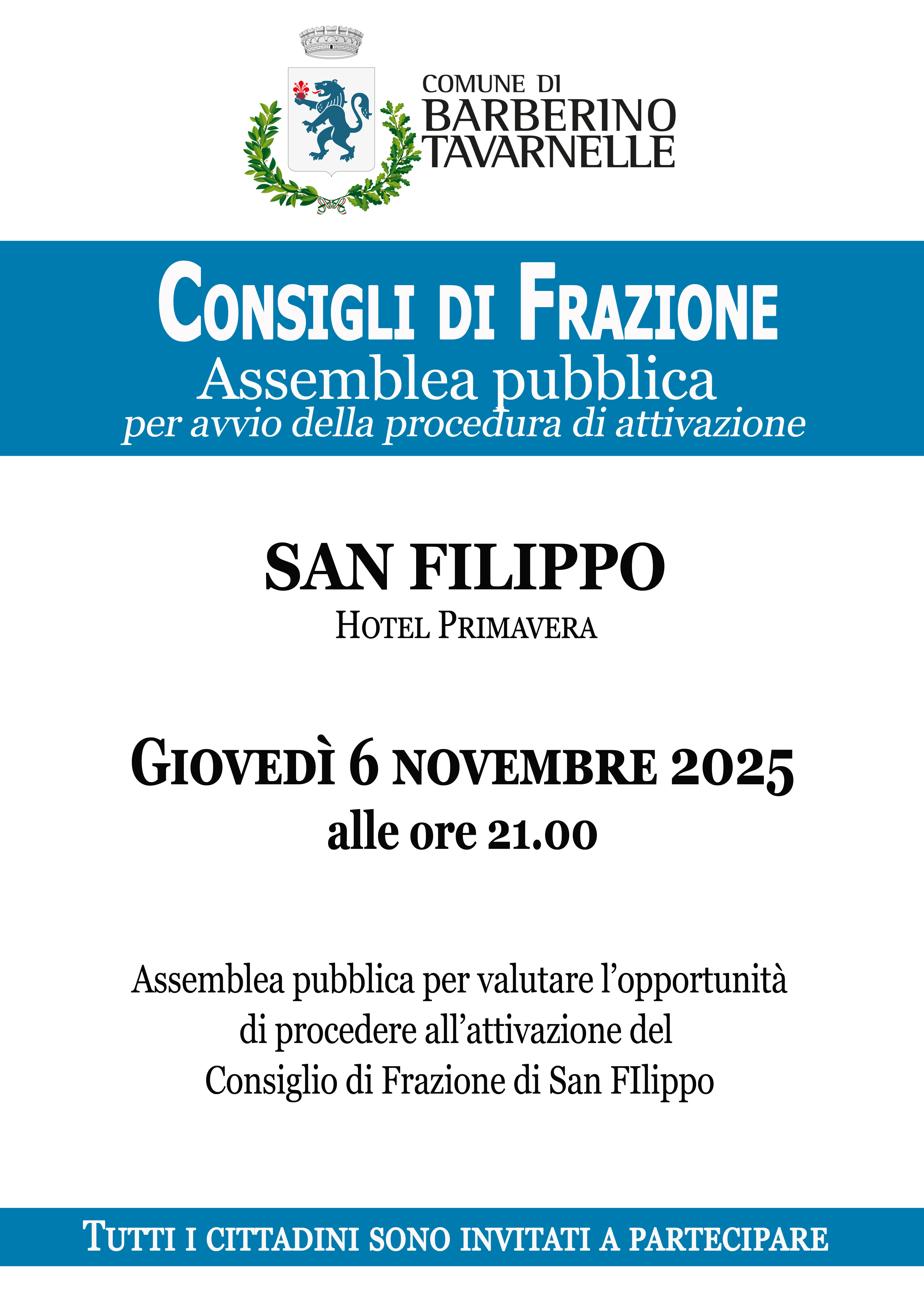 Assemblea pubblica per valutare la possibilità di procedere all'attivazione del Consiglio di Frazione di Sal Filippo. Tutta la cittadinanza è invitata a partecipare.