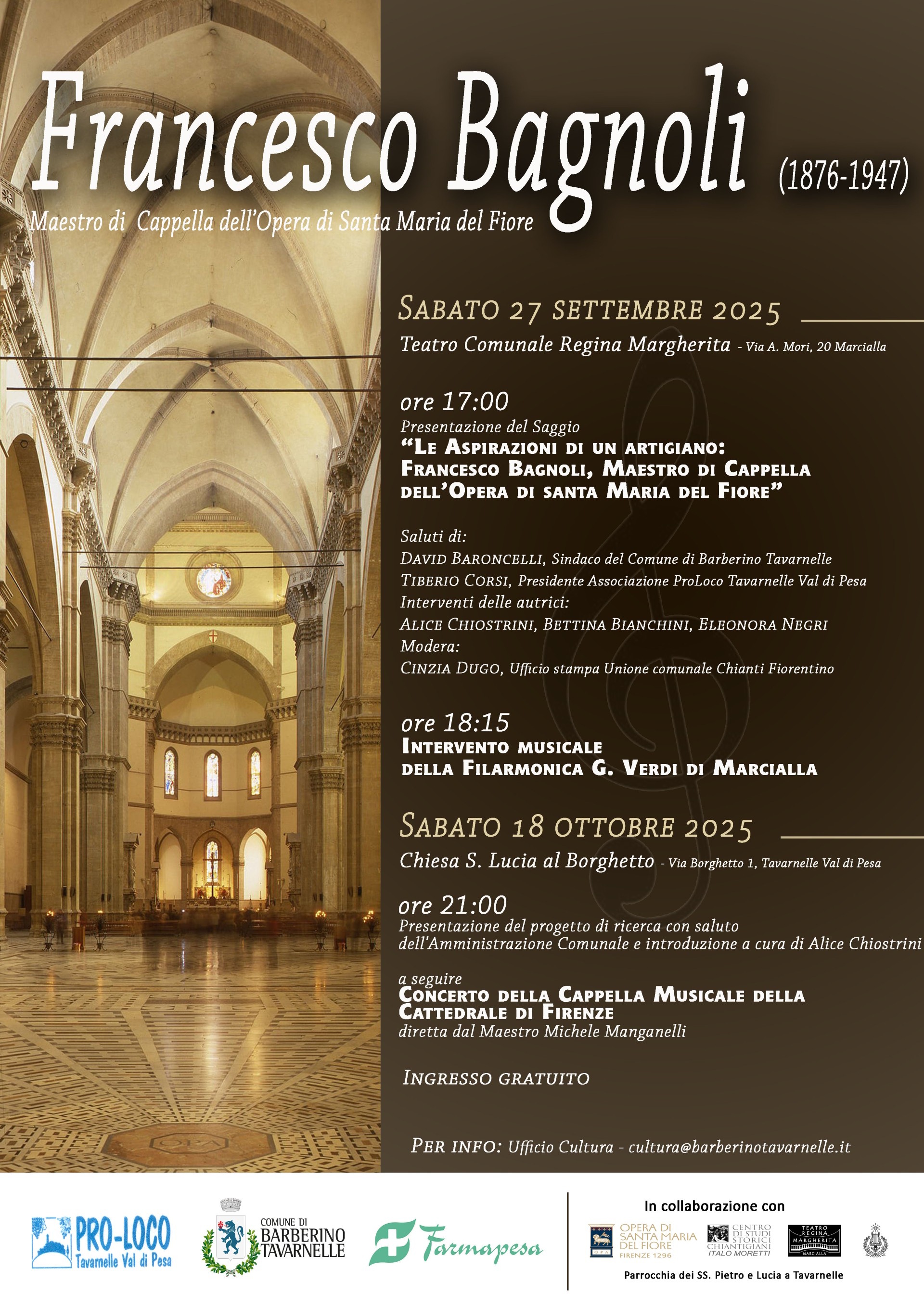 La ricerca storica, curata e coordinata dalla storica dell'arte Alice Chiostrini, ha puntato la lente di ingrandimento sulla giovinezza, vissuta nell’area di campagna di Marcialla, e sulla maturità trascorsa a Firenze dove Bagnoli esercitò il ruolo di Maestro di Cappella del Duomo. L’organista si rese noto come compositore. Scrisse diverse messe tra cui una Missa pro defunctis per i soldati morti in guerra (1918), oltre a mottetti, laudi, vespri. E’ stato il Teatro Comunale Regina Margherita ad ospitare pochi giorni fa i risultati dello studio confluiti nella presentazione del volume “Le Aspirazioni di un artigiano: Francesco Bagnoli, Maestro di Cappella dell’Opera di Santa Maria del Fiore” (Edizioni Polistampa). Ad illustrare i contenuti della ricerca, dopo i saluti del Sindaco di Barberino Tavarnelle e di Tiberio Corsi, Presidente della Pro Loco di Tavarnelle, sono state le autrici Alice Chiostrini, Bettina Bianchini, Eleonora Negri. Le esperte Bettina Bianchini ed Eleonora Negri hanno delineato la ricca produzione musicale di Francesco Bagnoli e il contesto della musica liturgica nel ventesimo secolo. Il pomeriggio si è concluso con una performance musicale della Filarmonica “Giuseppe Verdi” di Marcialla. Il progetto di riscoperta e valorizzazione della figura di Francesco Bagnoli dà appuntamento al 18 ottobre alle ore 21 presso Chiesa Santa Lucia al Borghetto con la presentazione del progetto di ricerca a cura di Alice Chiostrini e il Concerto della Cappella Musicale della Cattedrale di Firenze, diretta dal Maestro Michele Manganelli. Il programma delle iniziative si avvale della collaborazione dell'Opera di Santa Maria del Fiore di Firenze, del Teatro Comunale Regina Margherita di Marcialla, della Filarmonica “Giuseppe Verdi di Marcialla” e della Parrocchia dei SS. Pietro e Lucia a Tavarnelle.