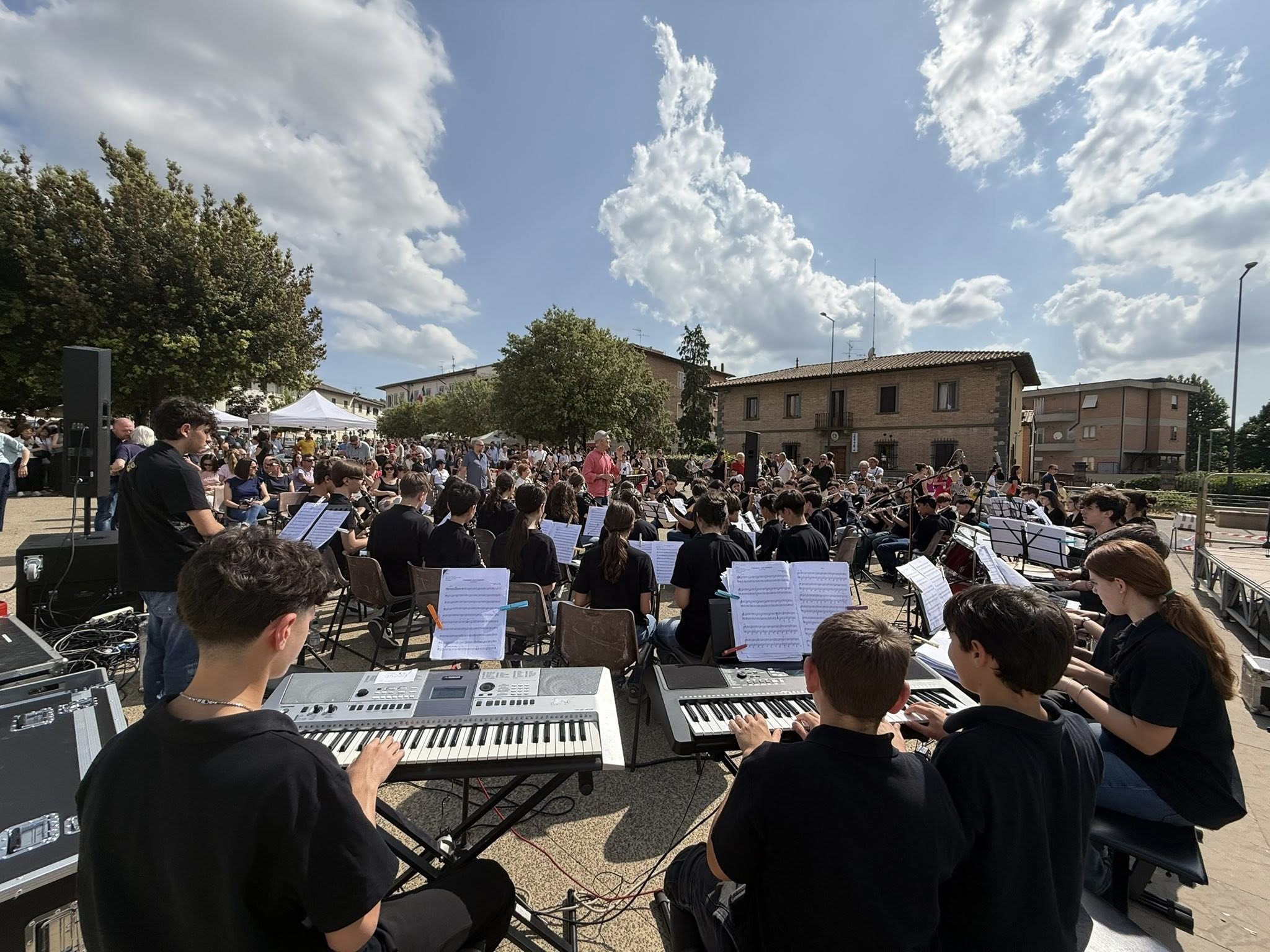 La scuola ha scelto di uscire dai propri ambienti per festeggiare e raccontarsi alle famiglie negli spazi pubblici dove la comunità si ritrova. Sul palcoscenico di piazza Matteotti, allestito per l’occasione, si sono riuniti e si sono esibiti, i ragazzi e le ragazze delle primarie delle classi quarte e quinte e l’orchestra delle classi seconde e terze della scuola secondaria delle sezioni di strumento musicale. L’iniziativa, che nella seconda parte del pomeriggio ha previsto anche la restituzione del viaggio della memoria cui hanno preso parte alcuni alunni e alunne della secondaria di primo grado, accompagnati dalla Consigliera Comunale Valentina Cerrini, è stata organizzata dall’Istituto Comprensivo in collaborazione con il Comune di Barberino Tavarnelle