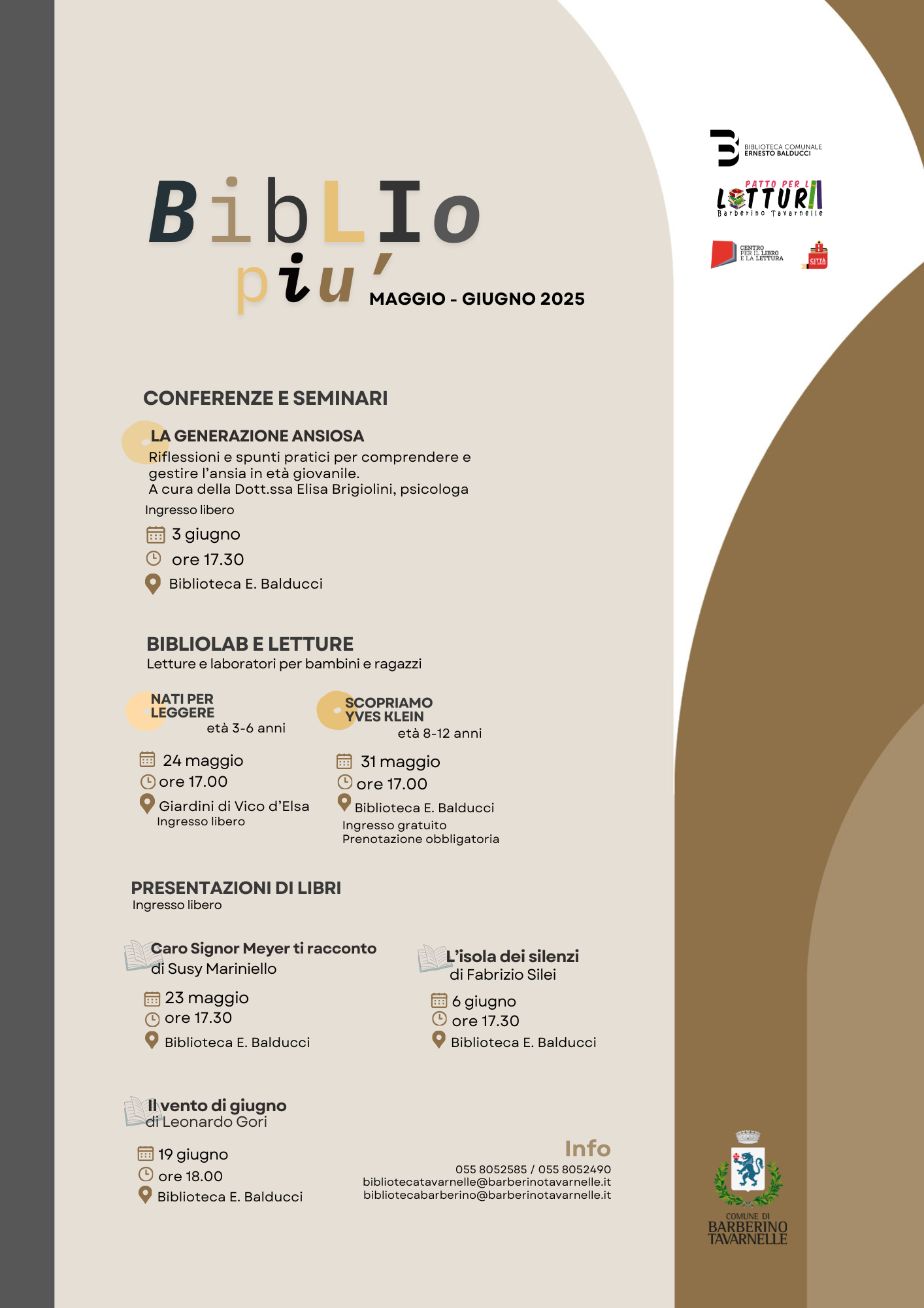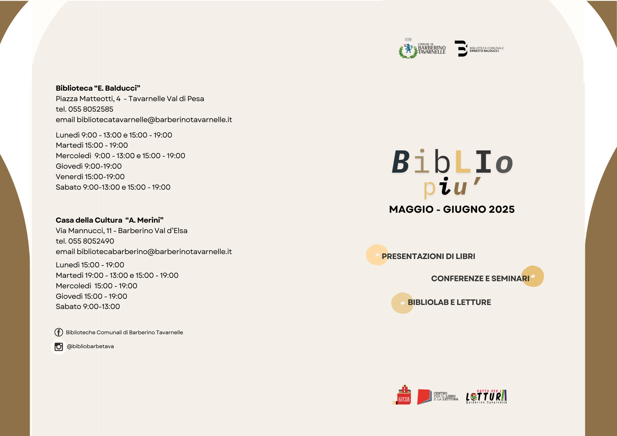 Le Biblioteche Comunali di Barberino Tavarnelle presentano il programma Bibliopiù maggio - giugno 2025, un ricco calendario di appuntamenti che comprende letture, laboratori, conferenze e presentazioni di libri.