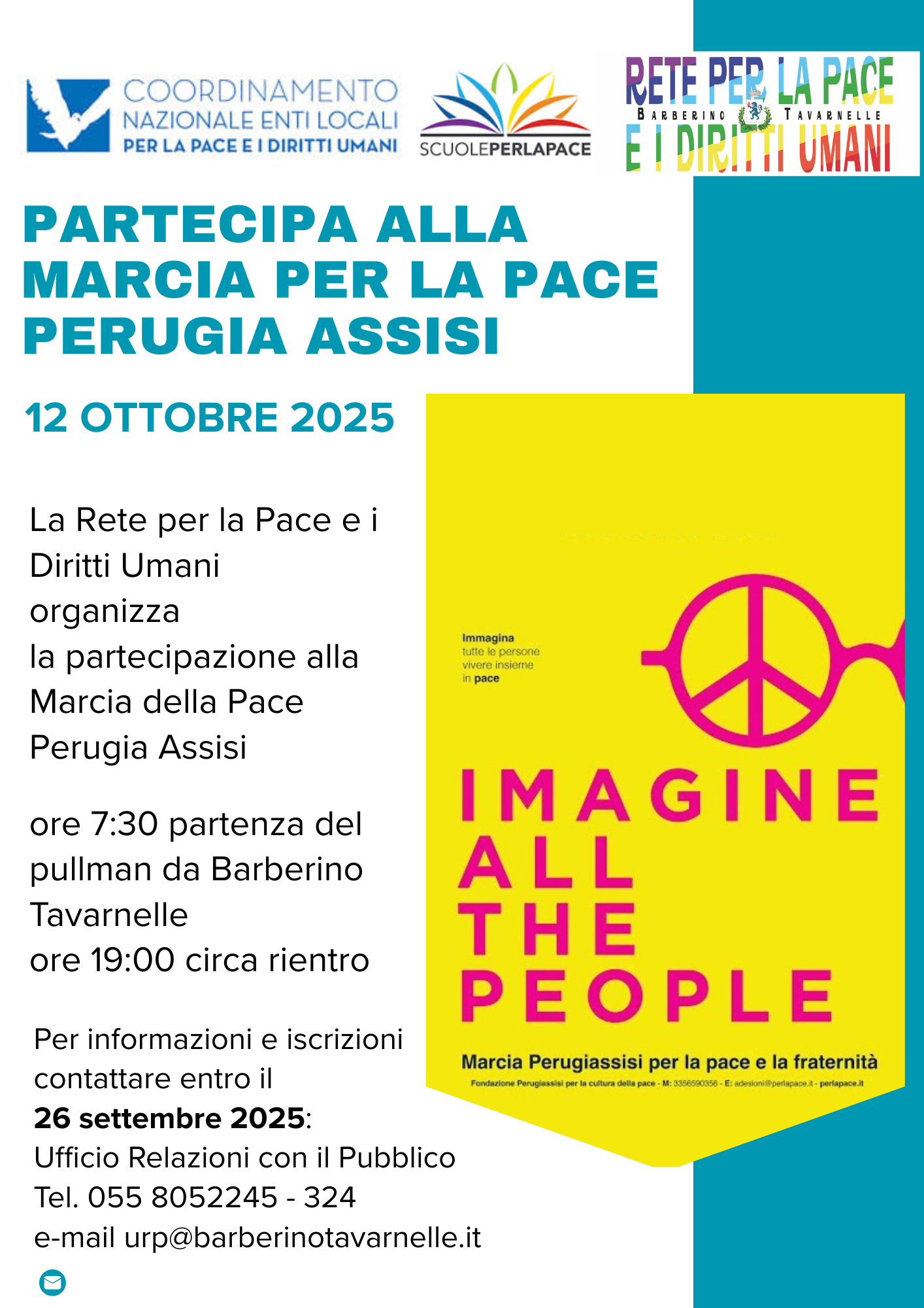 La Rete per la Pace e i diritti umani, organizza la partecipazione alla Marcia della pace e della fraternità per difendere il valore primario della pace e ricostruire insieme una coscienza, una cultura e una politica di pace che si esprima attraverso la cura degli altri, dell'umanità e del pianeta.