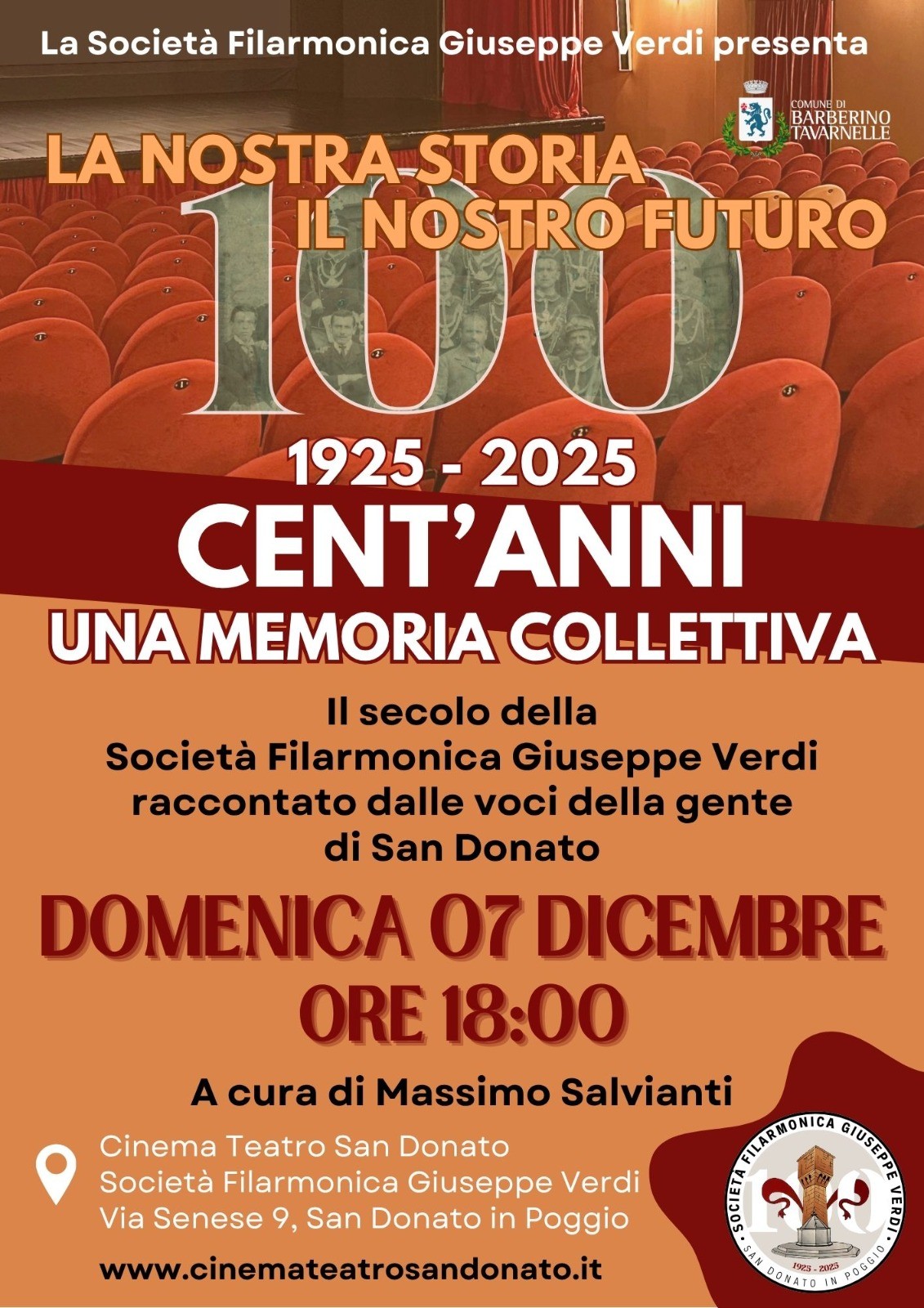 Nell'ambito degli eventi per i 100 anni dalla fondazione dell'associazione Società Filarmonica G. Verdi di San Donato in Poggio, una lettura collettiva incentrata sulle vicende, sui personaggi e sul periodo storico che ha attraversato, il tutto raccontato dalle voci della gente di San Donato in Poggio.