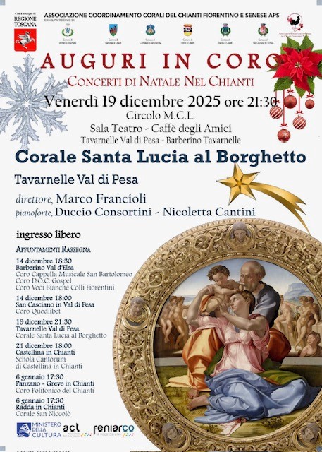 L’associazione Coordinamento Corali del Chianti Fiorentino e Senese Aps, con il patrocinio dei Comuni di Barberino Tavarnelle, Castellina in Chianti, Castelnuovo Berardenga, Greve in Chianti, Radda in Chianti, San Casciano, presenta l’edizione 2025 di Auguri in Coro, concerti di Natale nel Chianti.