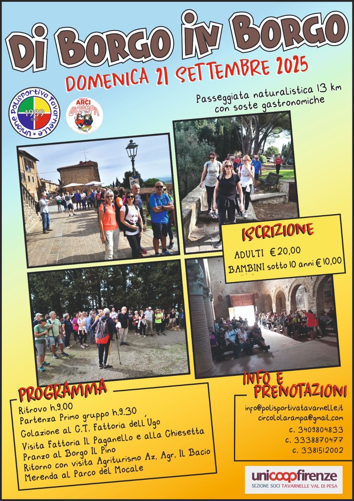 Torna a Barberino Tavarnelle "Di borgo in borgo", La camminata naturalistica lunga 13 Km con soste culturali e gastronomiche promossa da A.S.D Unione Polisportiva Tavarnelle, LaRampa Arci e Sezione Soci Coop di Tavarnelle.