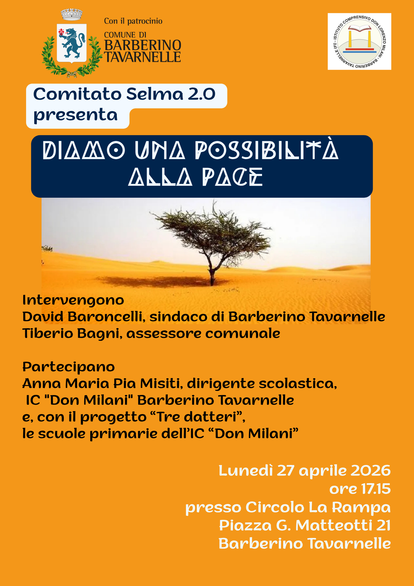 Il Comitato Selma 2.0, vi invita ad un incontro speciale dedicato alla pace e alla solidarietà. Insieme alle istituzioni locali e al mondo della scuola, presenteremo il progetto "Tre datteri".