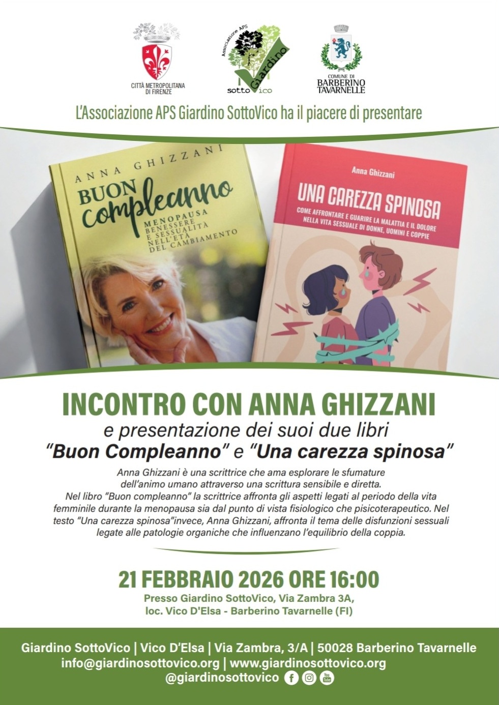 L'associazione APS Giadino SottoVico ha il piacere di ospitare Anna Ghizzani, una scrittrice che ama esplorare le sfumature dell'animo umano attraverso una scrittura sensibile e diretta.