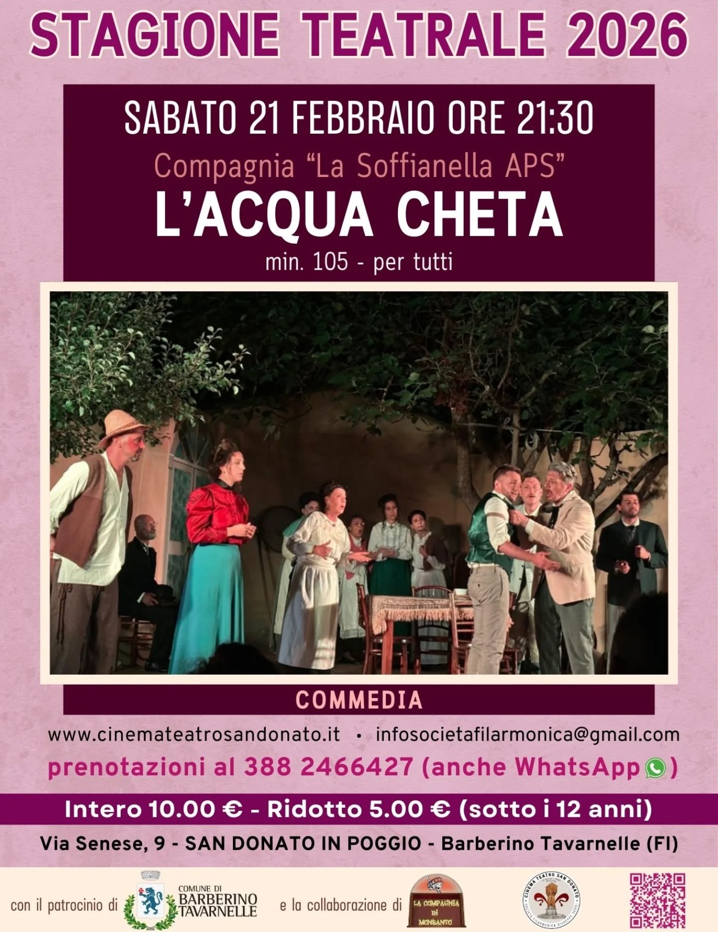 Sabato 21 febbraio 2026 la Compagnia "La Soffianella APS" porterà in scena lo spettacolo teatrale "L'acqua Cheta".