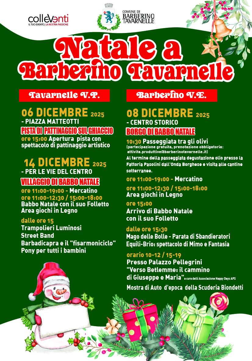 Per le vie del borgo si potrà respirare la magia del Natale, con giochi in legno, mercatini, l'Angolo di Babbo Natale con il suo Folletto, la Parata degli Sbandieratori e lo spettacolo di mimo e fantasia.