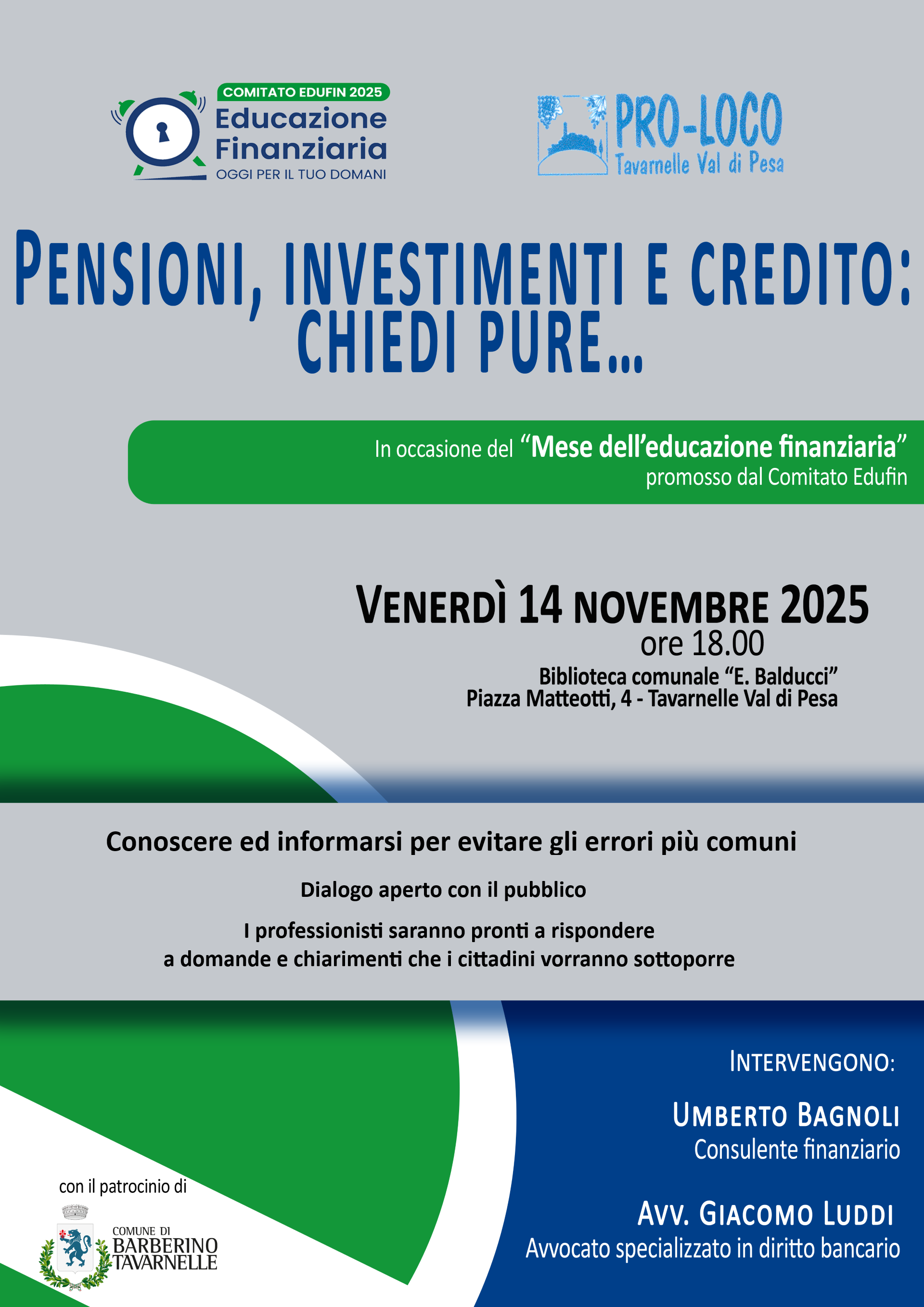 In occasione del Mese dell'Educazione Finanziaria, promosso dal Comitato Edufin, si invitano i cittadini al consueto appuntamento per conoscere ed informarsi, ed evitare gli errori più comuni.