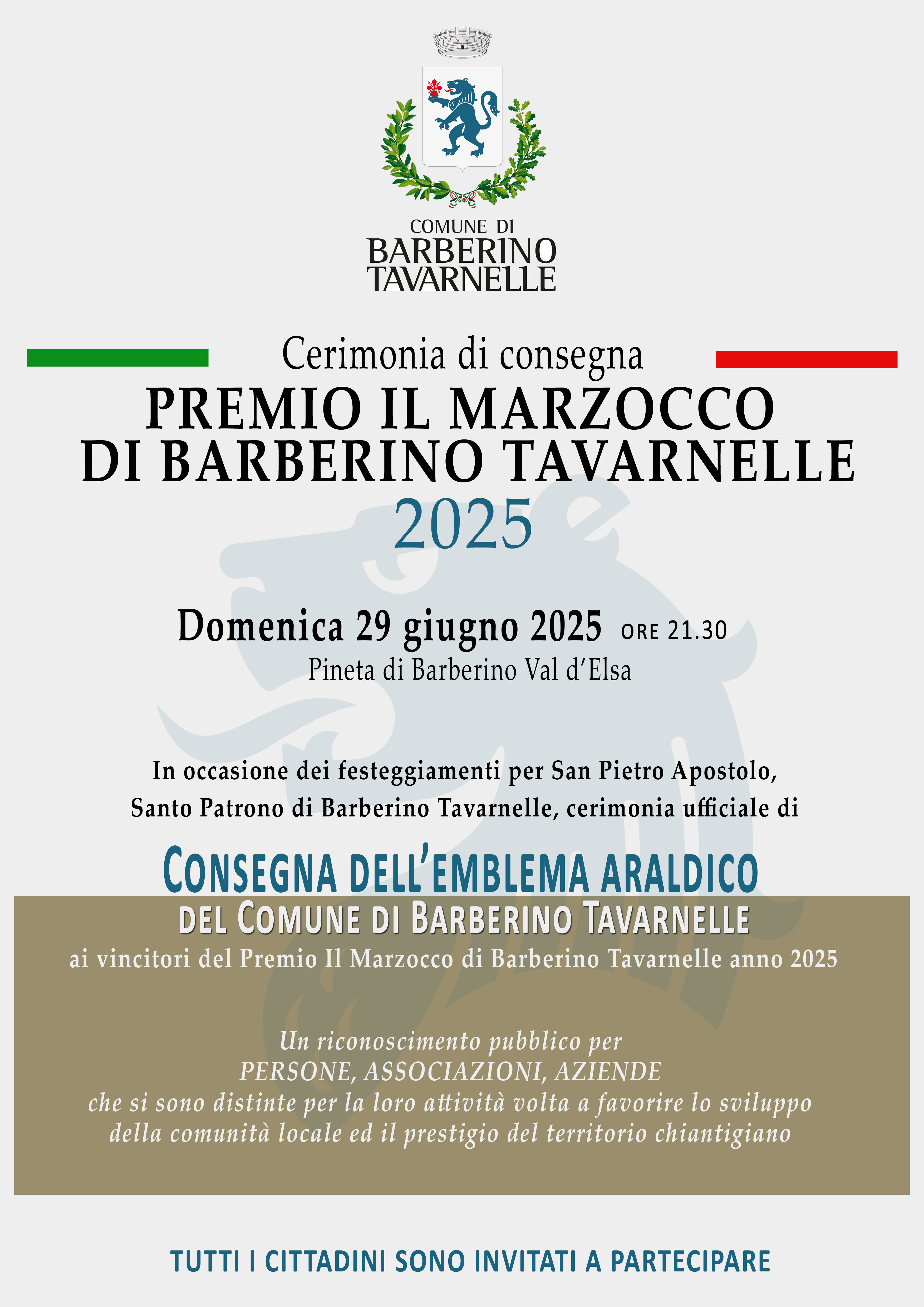 In occasione dei festeggiamenti per San Pietro Apostolo, Santo Patrono di Barberino Tavarnelle, si terrà la cerimonia ufficiale di consegna dell'emblema araldico del Comune di Barberino Tavarnelle ai vincitori del Premio Il Marzocco 2025. Un riconoscimento pubblico per persone, associazioni ed aziende che si sono distinte per la loro attività volta a favorire lo sviluppo della comunità locale ed il prestigio del territorio chiantigiano.
